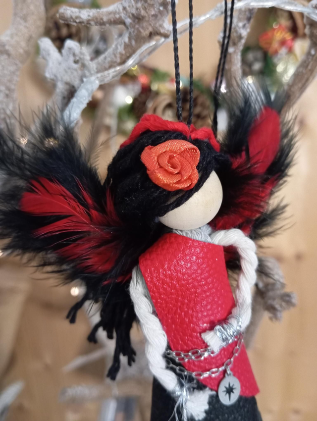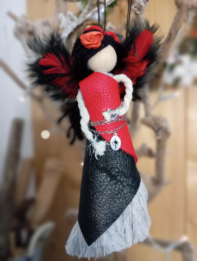 Composée d'une perle de bois, de corde de coton et de cuir et de bijoux recyclés. Agrémentées de jolies plumes noir et rouge.