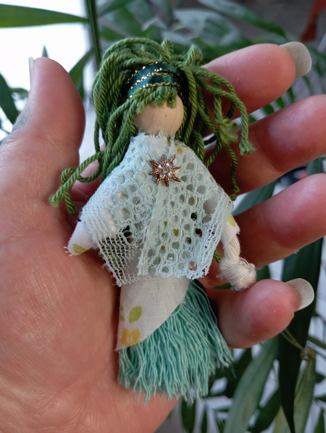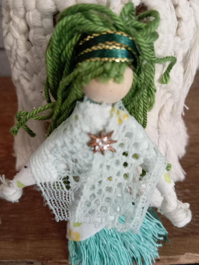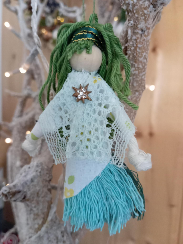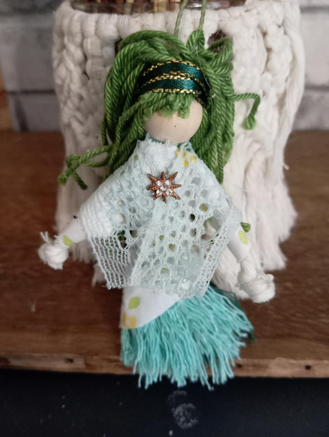 Réalisée à la main, avec des matériaux recyclés comme la laine, le coton et le tissu et le ruban dentelle.
